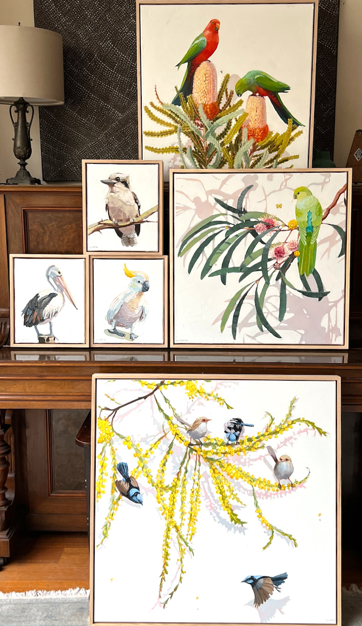 Original oil on canvas artworks by Kirsty McIntyre featuring Australian native birds...