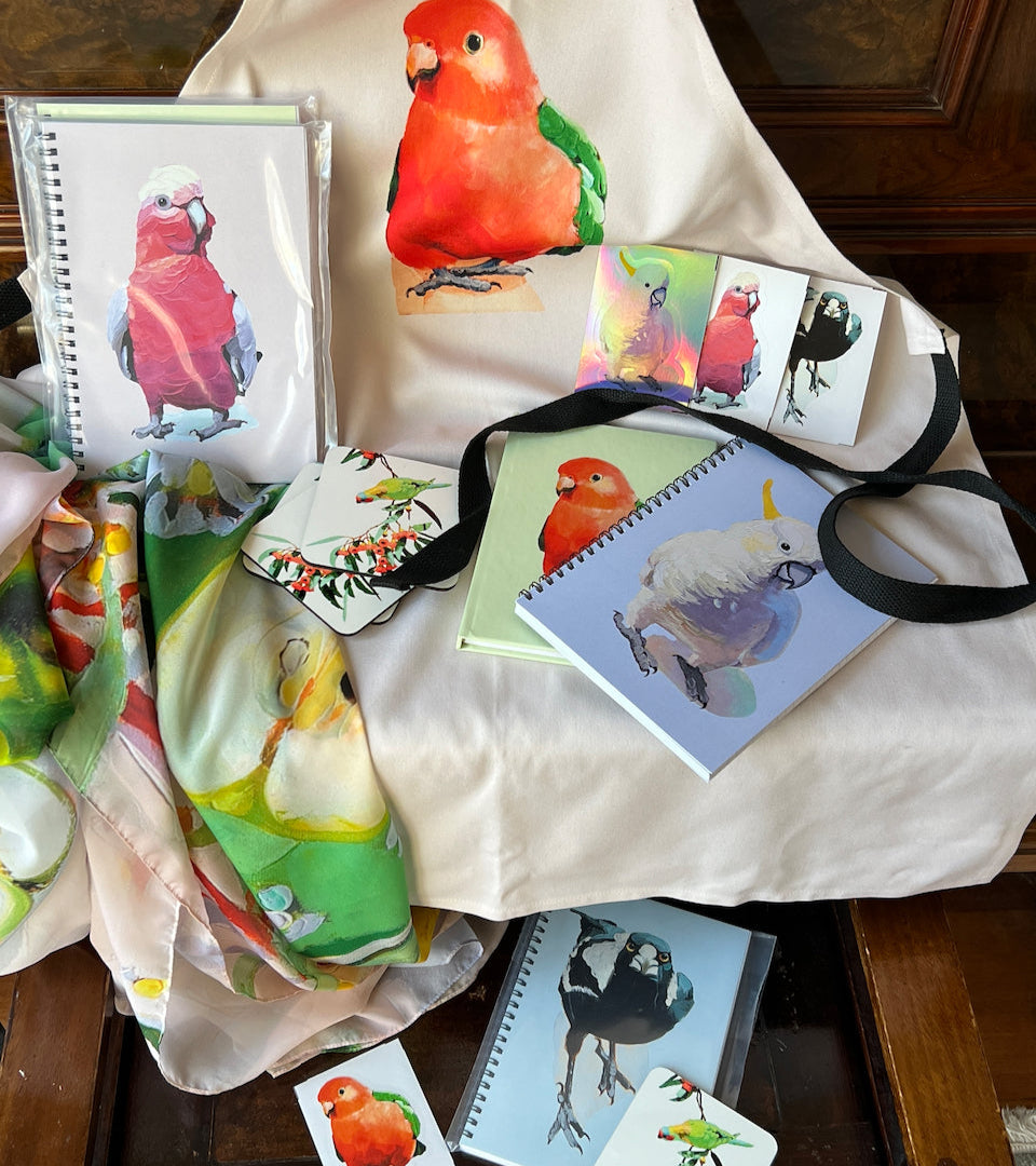Red Bubble is an Australian print on demand store for artists which operates on a separate website. Before I engaged my own printers I had a play with uploading my designs and after sampling chose a few of my favourite products like scarves, stickers, notebooks aprons etc to remain available there. Whilst a little pricey and shipping costs often can't be combined there are frequent sales and its the only place you can find my scarves, notebooks, coasters and phone cases!