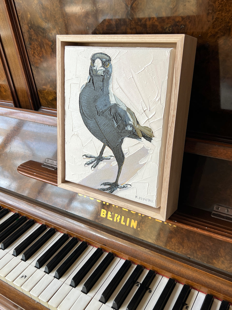 23x28cm including the floating ash frame, painted with brush and palette knife, oil paint on canvas to provide a pleasing, textured surface.