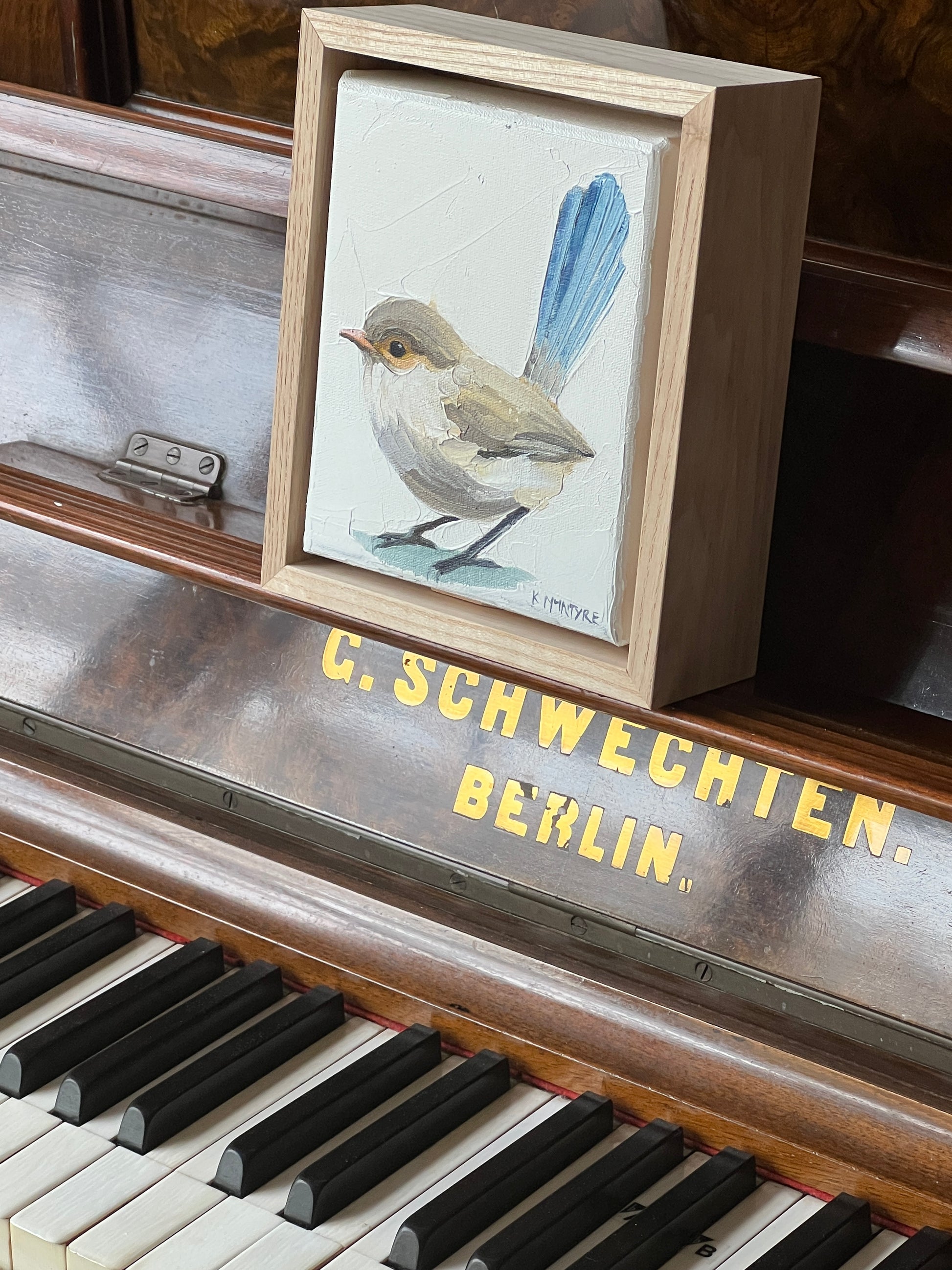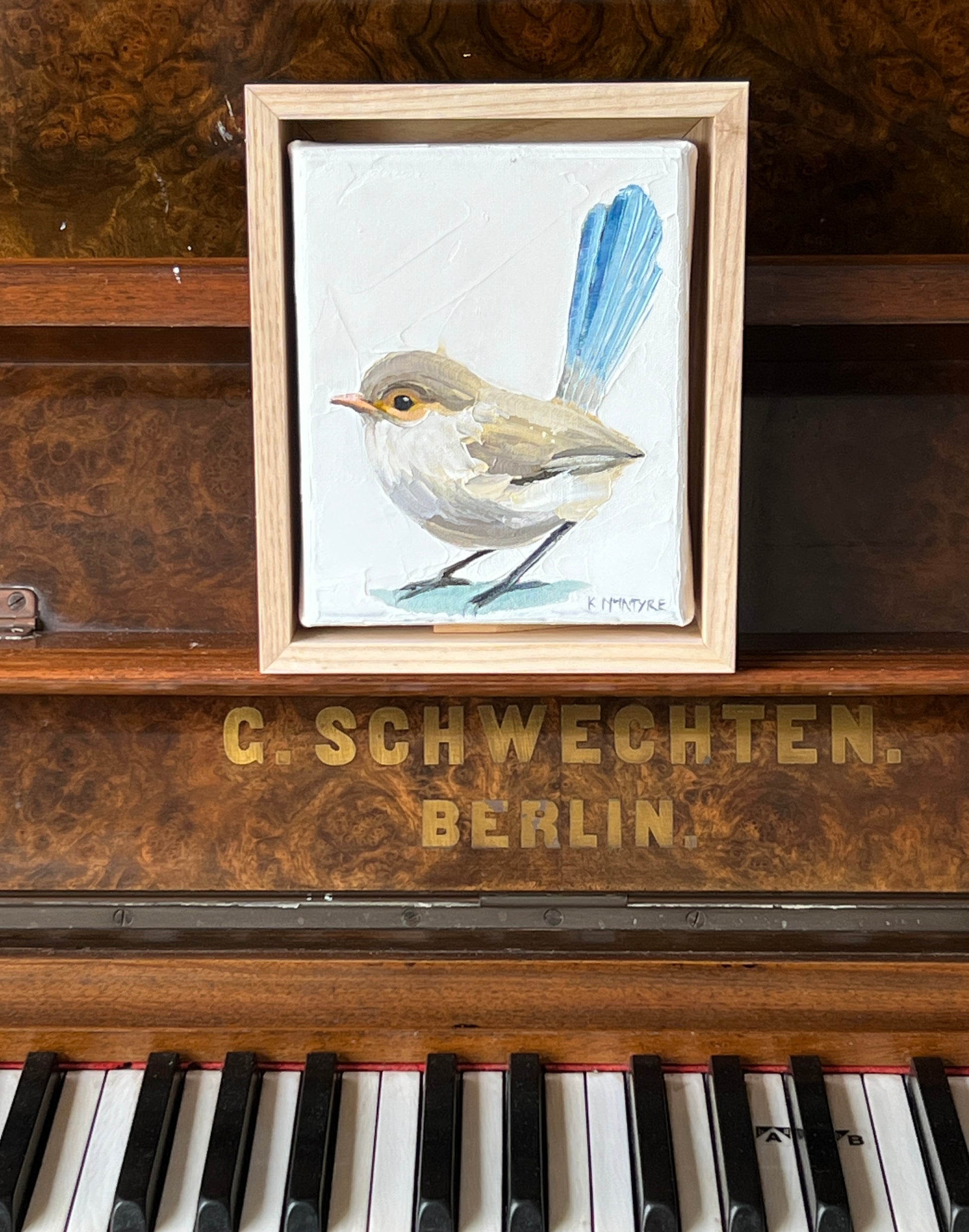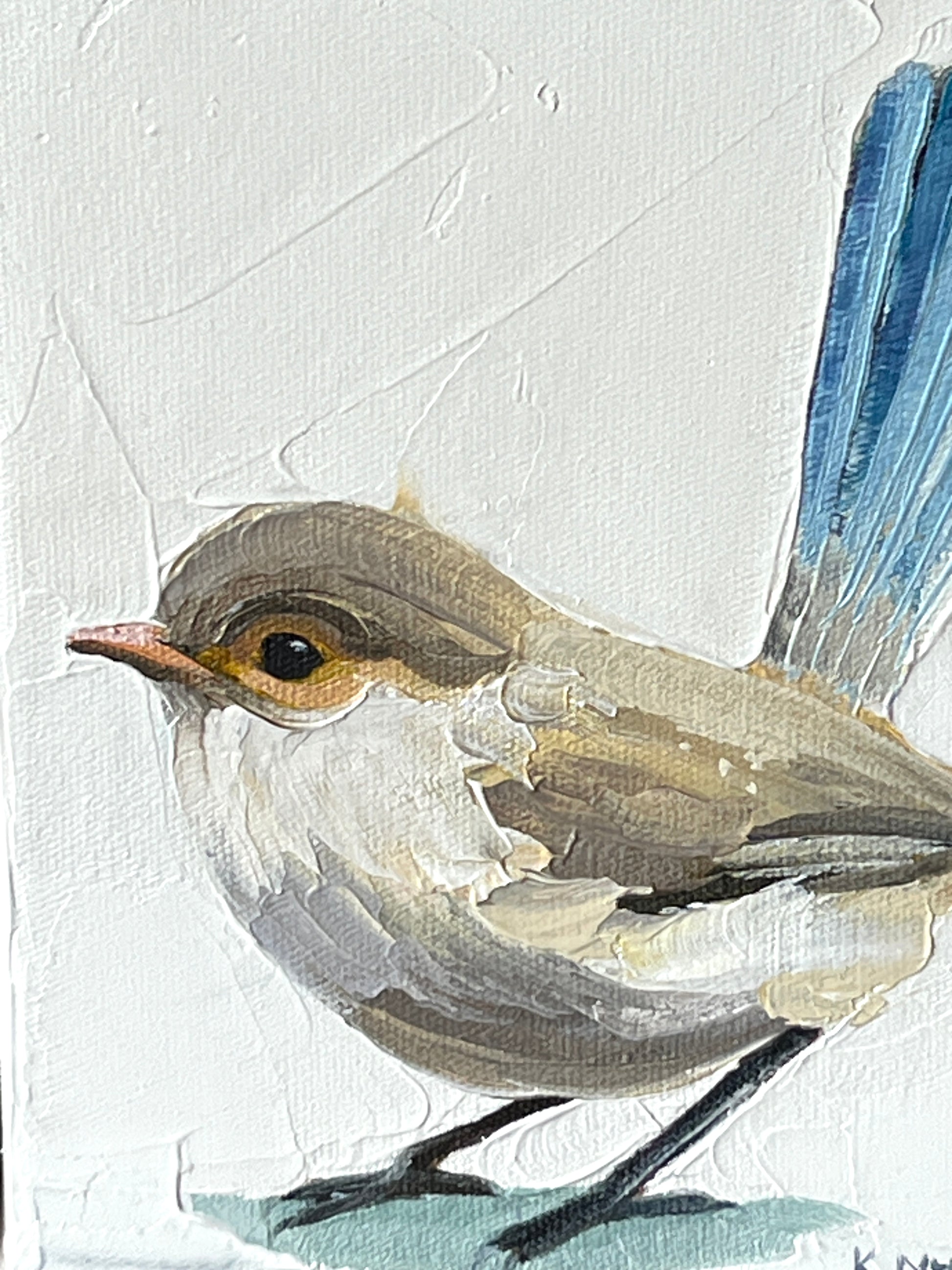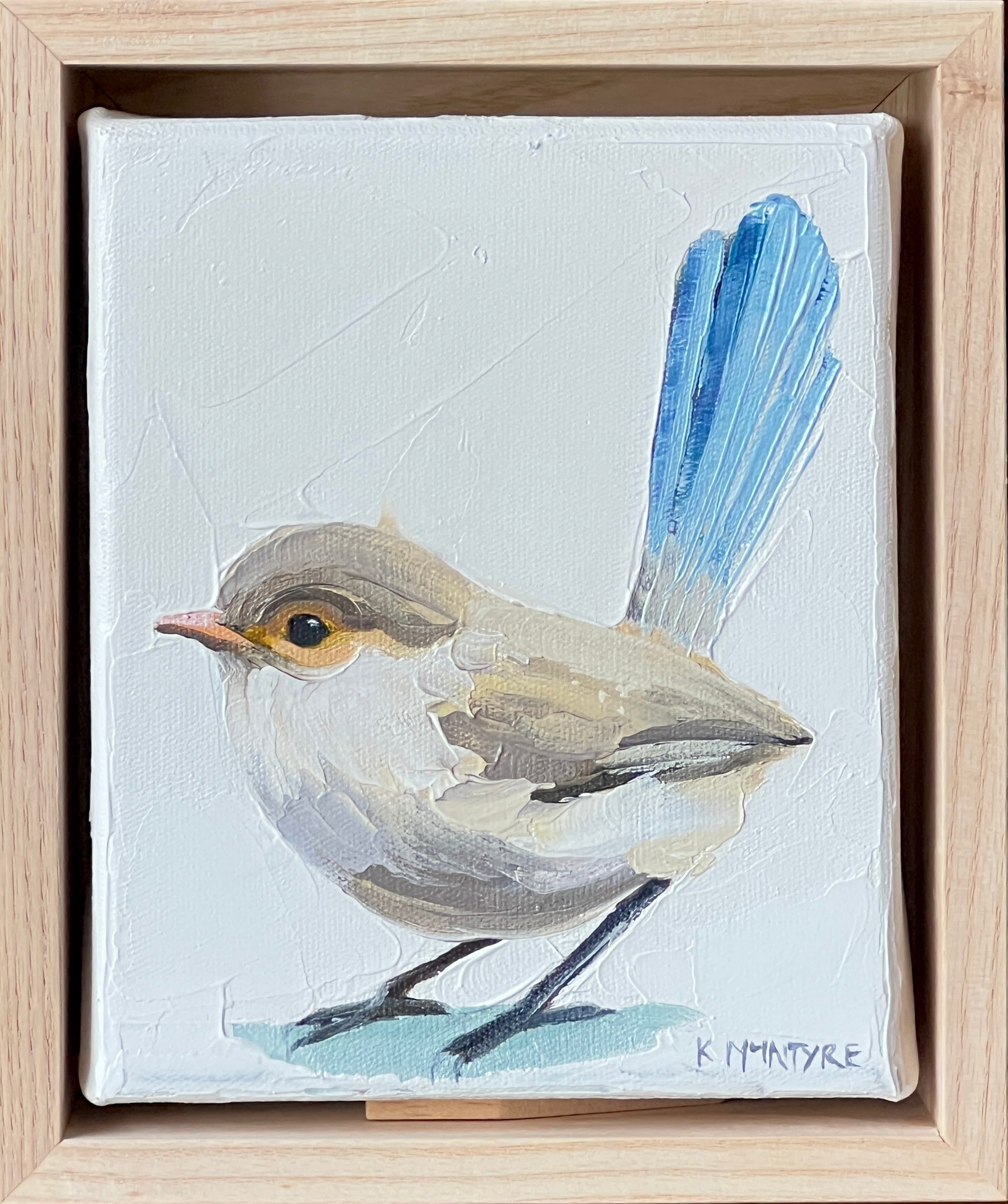 Presenting a gorgeous little female splendid blue wren for your enjoyment- an original artwork in my "tiny bird" series. Painted with brush, palette knife in oil paint framed in natural ash. Measures 15x18cm, works beautifully on the wall or standing on a shelf.