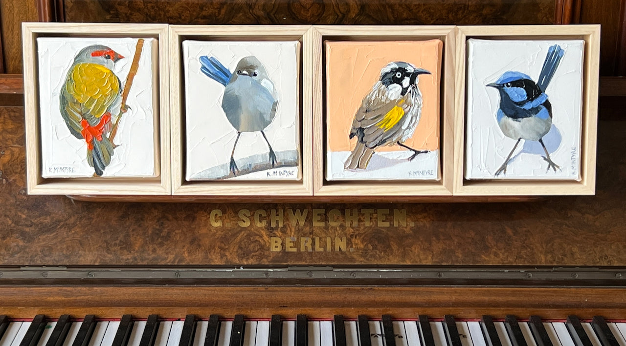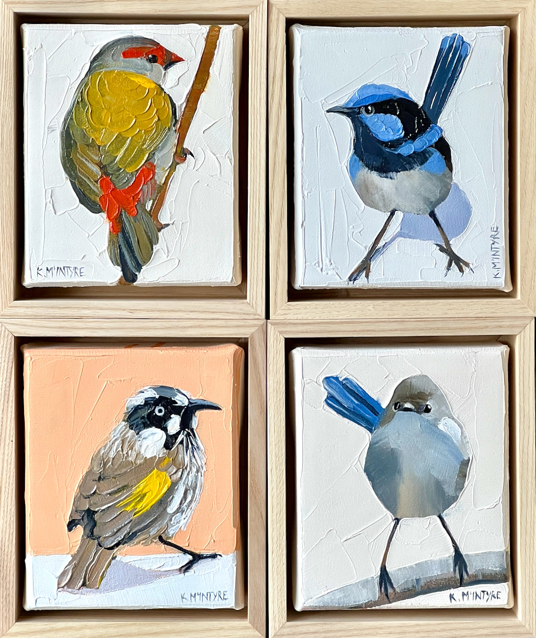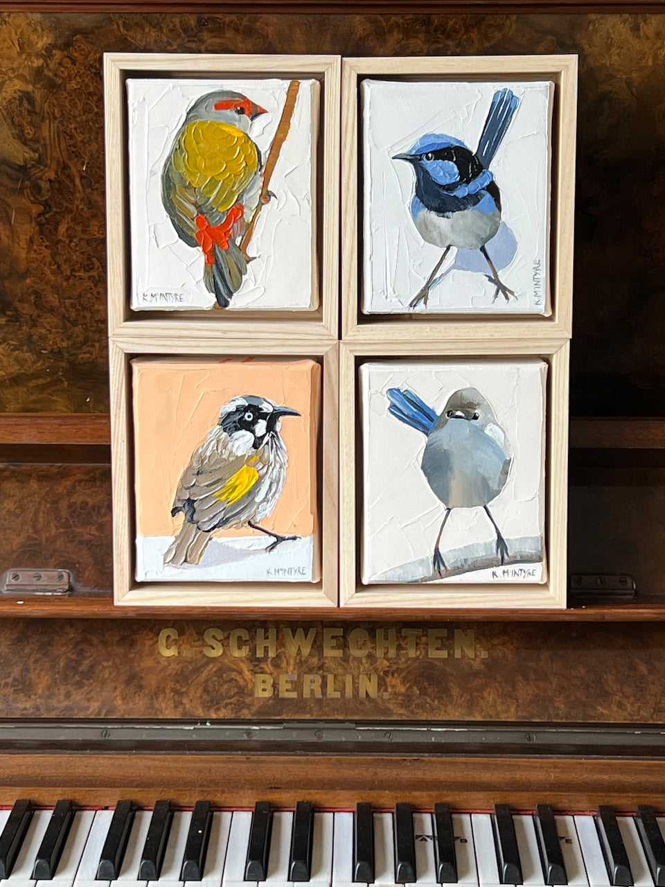 Presenting a momentary image of a red browed finch in my "tiny bird" series. This original artwork is painted with brush, palette knife in oil paint framed in natural ash. Measures 15x18cm, works beautifully on the wall or standing on a shelf.