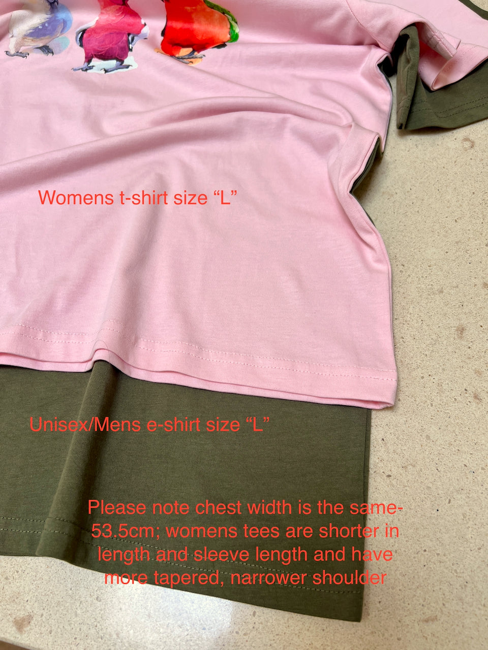 Perfect for the bird lovers in your life- a nice, medium weight fabric with a smooth finish and a fun design. I recommend measuring a well fitting t-shirt of your own at chest level and checking against the width in the chart below. ***Please note tees are printed to especially for your order and cannot be exchanged or refunded unless faulty***