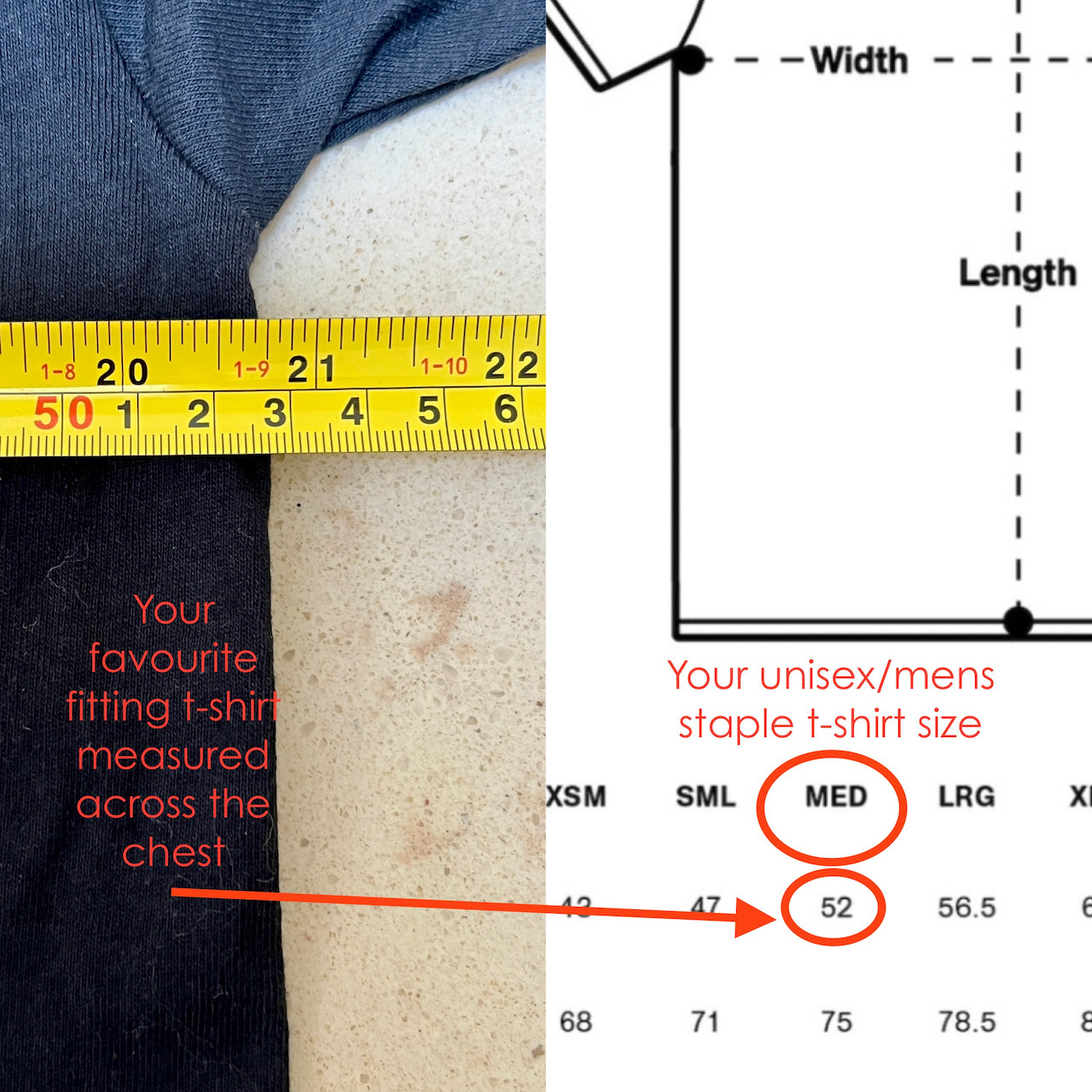 Regarding sizing; I recommend measuring a preferred fitting t-shirt of your own at chest level and checking against the width in the chart below. A womens size 12 for example might be a snug M, a loose L or a looser XL.