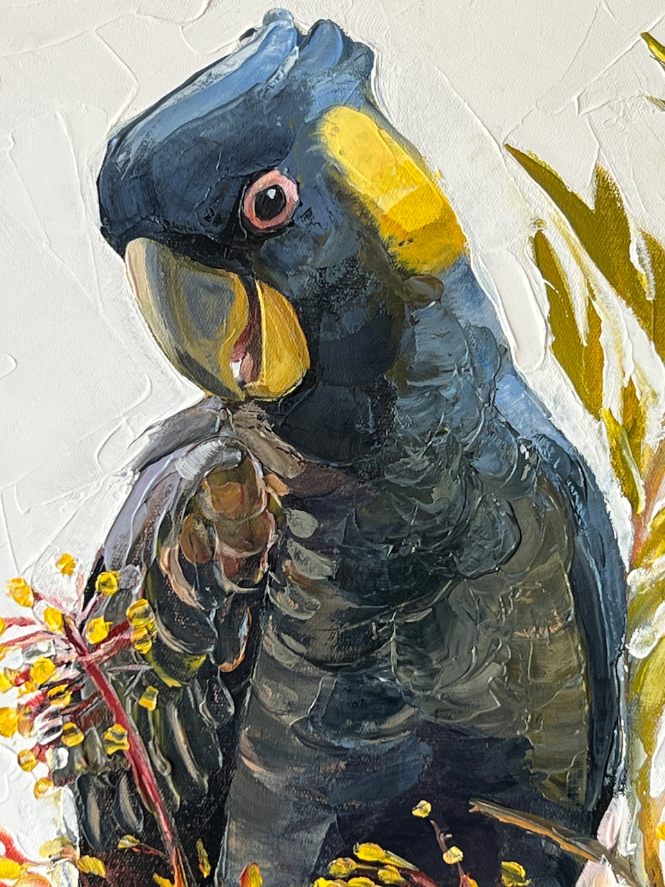 43x63cm Original oil on canvas artwork by Kirsty McIntyre featuring a gorgeous yellow tailed black cocky in a silky oak- which is actually a big grevillea!? Price includes the floating natural ash frame and shipping within Australia (nominal shipping internationally added at checkout)